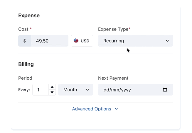 Fill in the necessary details for your one-time expense. You can add the same details for one-time expenses as for subscriptions (name, website, category, tags, amount, currency, etc..)