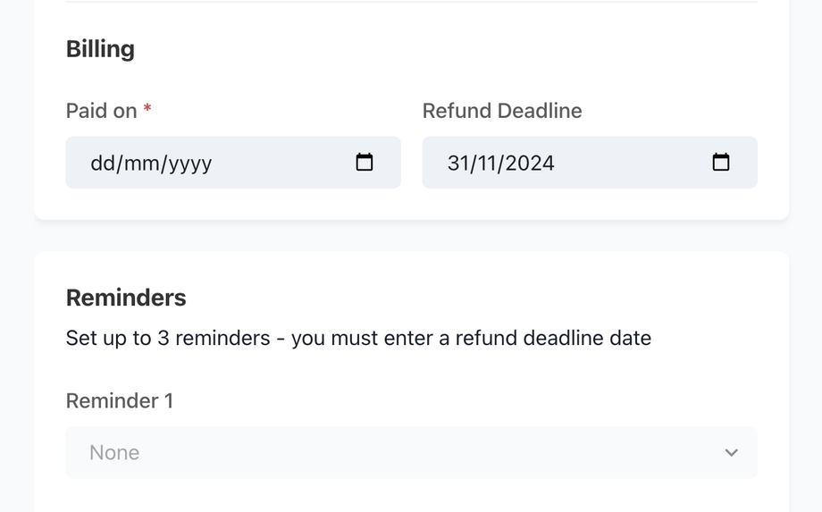 Set a Reminder One of the most useful features of Subly is the ability to set reminders for expenses. When you add a one-time expense, you can set a reminder for things like a refund deadline. This is particularly helpful for purchases like LTDs (software lifetime deals) and other purchases in which you have a period of refund.