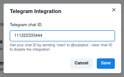 /startYou will receive a unique Chat ID - Enter the Chat ID from the Subly Bot and click save.
