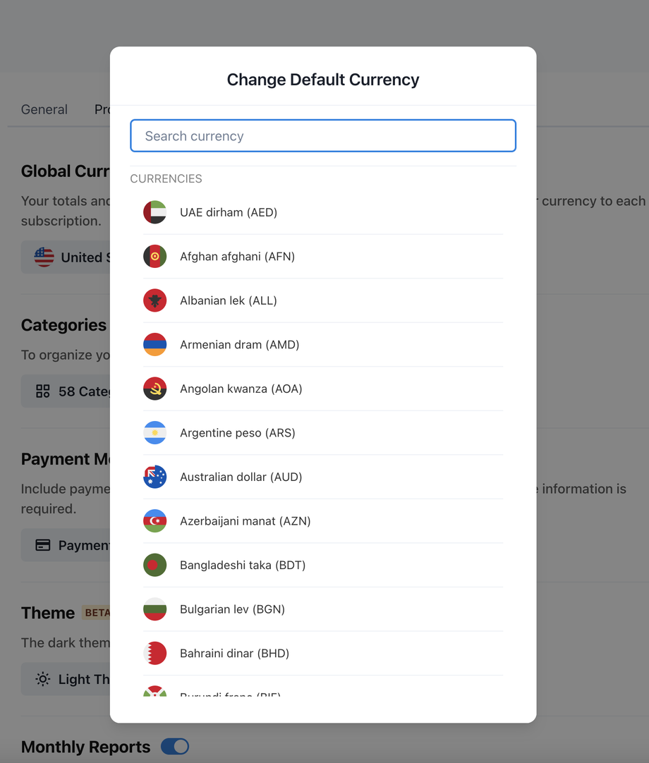 Select your preffered currency in the modal and that's it! Now all your reports al calculations in the app will be displayed on the selected currency note that this setting doesn't affect your individual subscriptions, if you have subscriptions in a different currency those will remain the same.